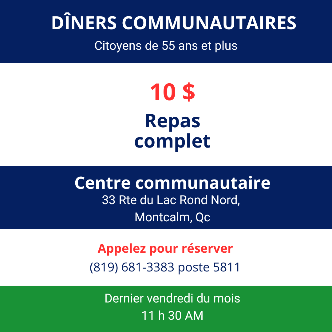 Les dîners communautaires permettent aux gens de 55 ans et plus de se rencontrer et d’échanger autour d’un bon repas une fois par mois. Ces dîners sont préparés par un groupe de bénévoles attentionnés. Au coût de 10$, vous pourrez déguster un repas complet.